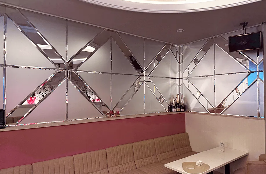 壁面に施されたミラー装飾が、光と奥行きを巧みに取り込み、視覚的な広がりと高級感を演出。現代的なアーティスティック空間デザインです。
