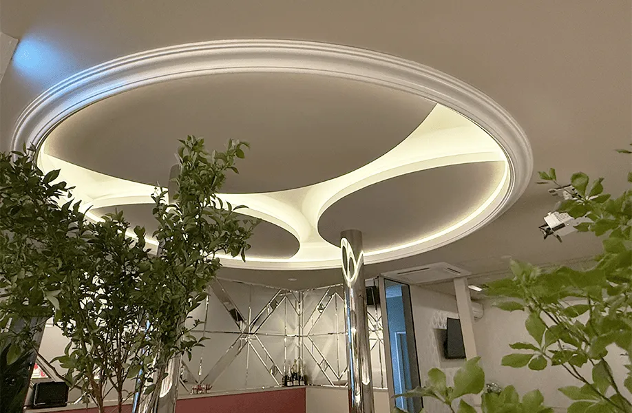 ラグジュアリーな装飾と光が織りなす天井アート。天井からやわらかにこぼれる光が、心をほどくように空間を包み込みます。喧騒を忘れ、静かに流れる上質な時間をお過ごし下さい。