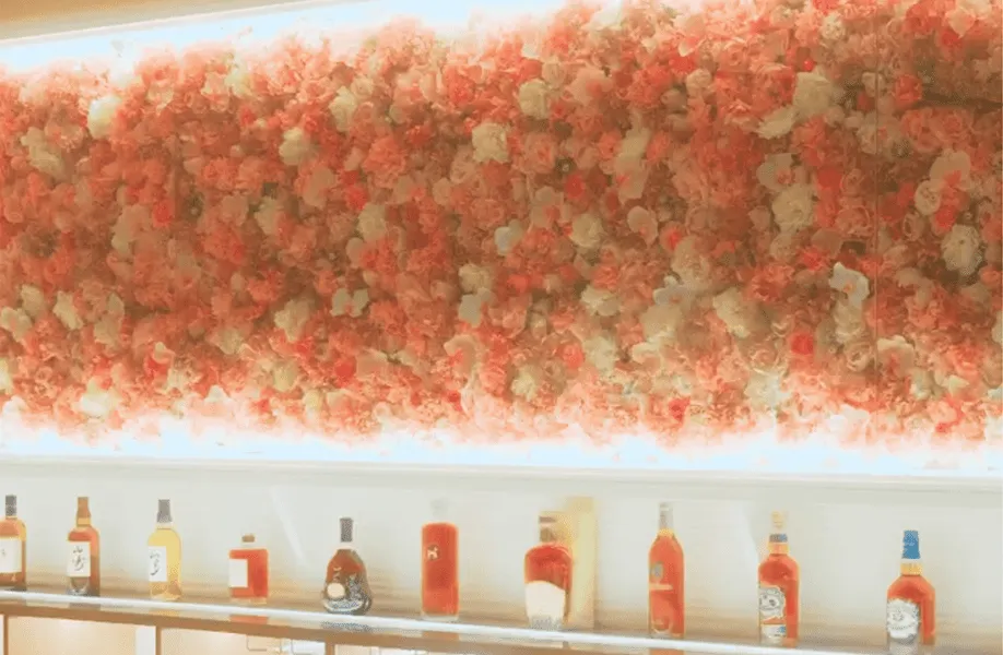 柔らかな光に包まれたフラワーウォールが、空間全体に華やぎとやさしさを添える特別なカウンター席。訪れるひとの心をやさしく癒す、ラグジュアリーなひとときをお楽しみ下さい。